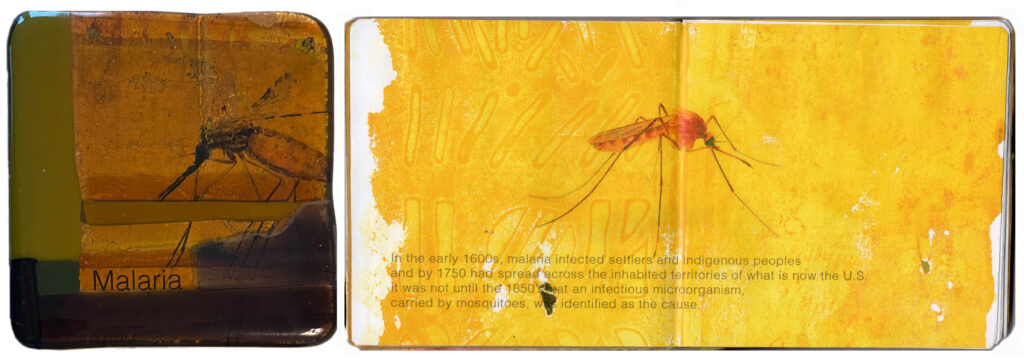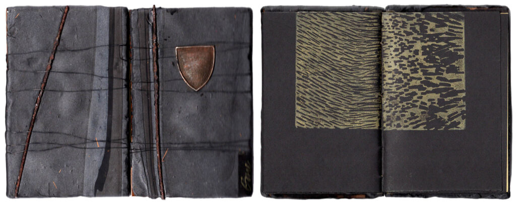 The book is Coptic bound, 6” x 4” with 40 collaged pages, eco printed with foliage and blueberries. There is a cover of stamped solder over brass with a small copper onlay and a paper wrapper.